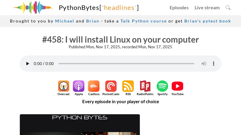 https://pythonbytes.fm/episodes/show/458/i-will-install-linux-on-your-computer