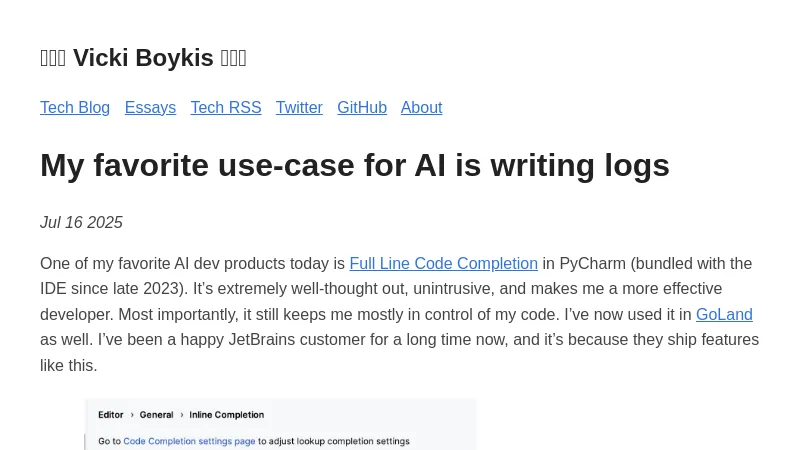 https://vickiboykis.com/2025/07/16/my-favorite-use-case-for-ai-is-writing-logs/